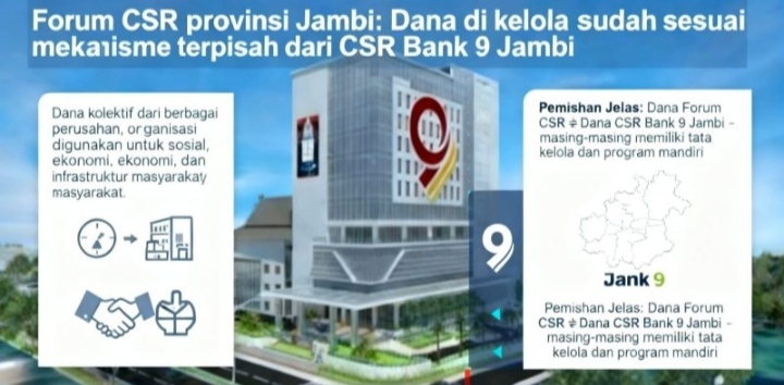 Forum CSR Provinsi Jambi juga menegaskan adanya pemisahan yang jelas antara dana yang dikelola forum dan dana Corporate Social Responsibility (CSR) milik Bank 9 Jambi sebagai institusi perbankan.