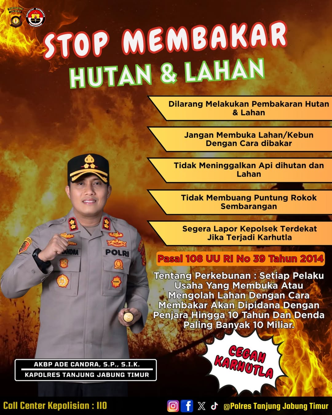 Jambiku.com, JAMBI – Polres Tanjab Timur – Dalam rangka upaya pencegahan terjadinya kebakaran hutan dan lahan (karhutla) khususnya di wilayah hukum Polres Tanjab Timur jelang hadapi Fenomena El Nino Tahun 2026, Kapolres Tanjab Timur Akbp Ade Candra, S.P., S.I.K., melalui Kasi Humas Polres Tanjab Timur Akp Edi Tasrif, S.E., menjelaskan bahwa pihaknya telah menyampaikan kepada Kapolsek jajaran Polres Tanjab Timur untuk melakukan himbauan baik secara lisan maupun pemasangan maklumat Kapolda Jambi dan spanduk tentang larangan aktivitas pembakaran pada saat membuka lahan hutan ataupun lahan perkebunan, Selasa (7/4/2026).